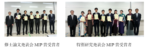 併せて、特別研究及び修士論文発表会MIP賞の表彰が大学12号館であり、