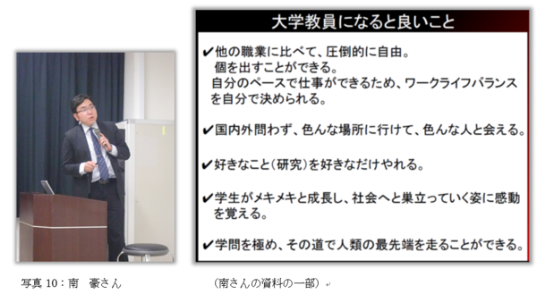 3番目に院生役員佐藤さんの紹介で、南豪さん(写真10:首都大学東京大学院 2011年 博士取得 久保研 東京大学生産技術研究所物質・環境系部門 講師 / 東京大学卓越研究員)が登壇しました。