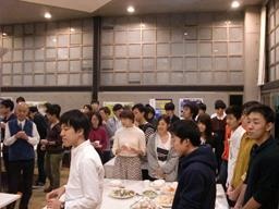 講演終了後、隣接するカフェテリア館で懇親会が18:00~20:00に開催されました。八木本同窓会会長と首都大学東京分子応用化学同窓会谷口さんの乾杯の音頭に始まり、追加再講演もあり、OBを囲んでの賑やかな懇親会が行われました。講演会に参加した学生を始め、都合で講演会には出席できなかった学生も加わり、過去最高の60名以上の学生の参加となりました。用意した飲食物はすべてあっという間に完飲・完食、昨年を更に上回るこれまでにない、今までの懇親会で一番の盛会になりました。(写真8,9,10,11)